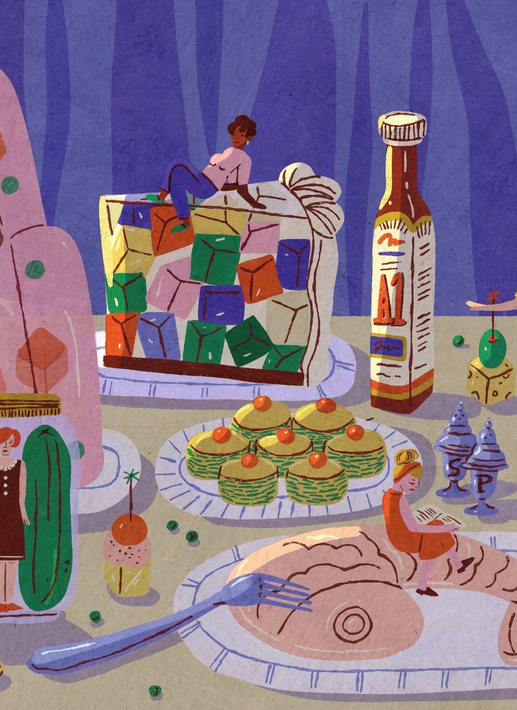 A header illustration made for a mock article about the wild west scene of gelatin based foods from midcentury times, exploring domesticity, food, and feminism.