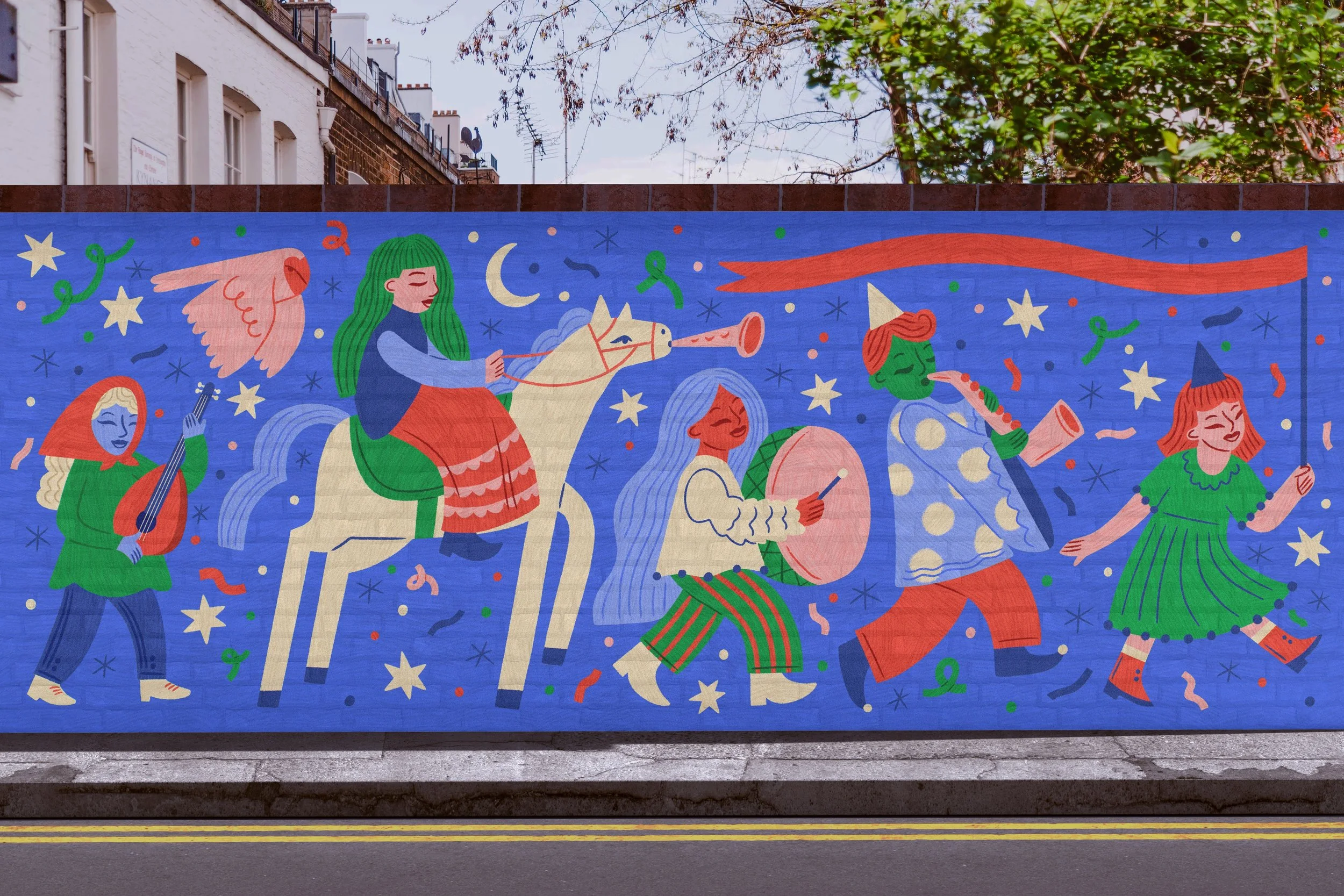 A mural design full of parade festivities and nocturnal creatures. Placed on a mockup for visual purposes.
