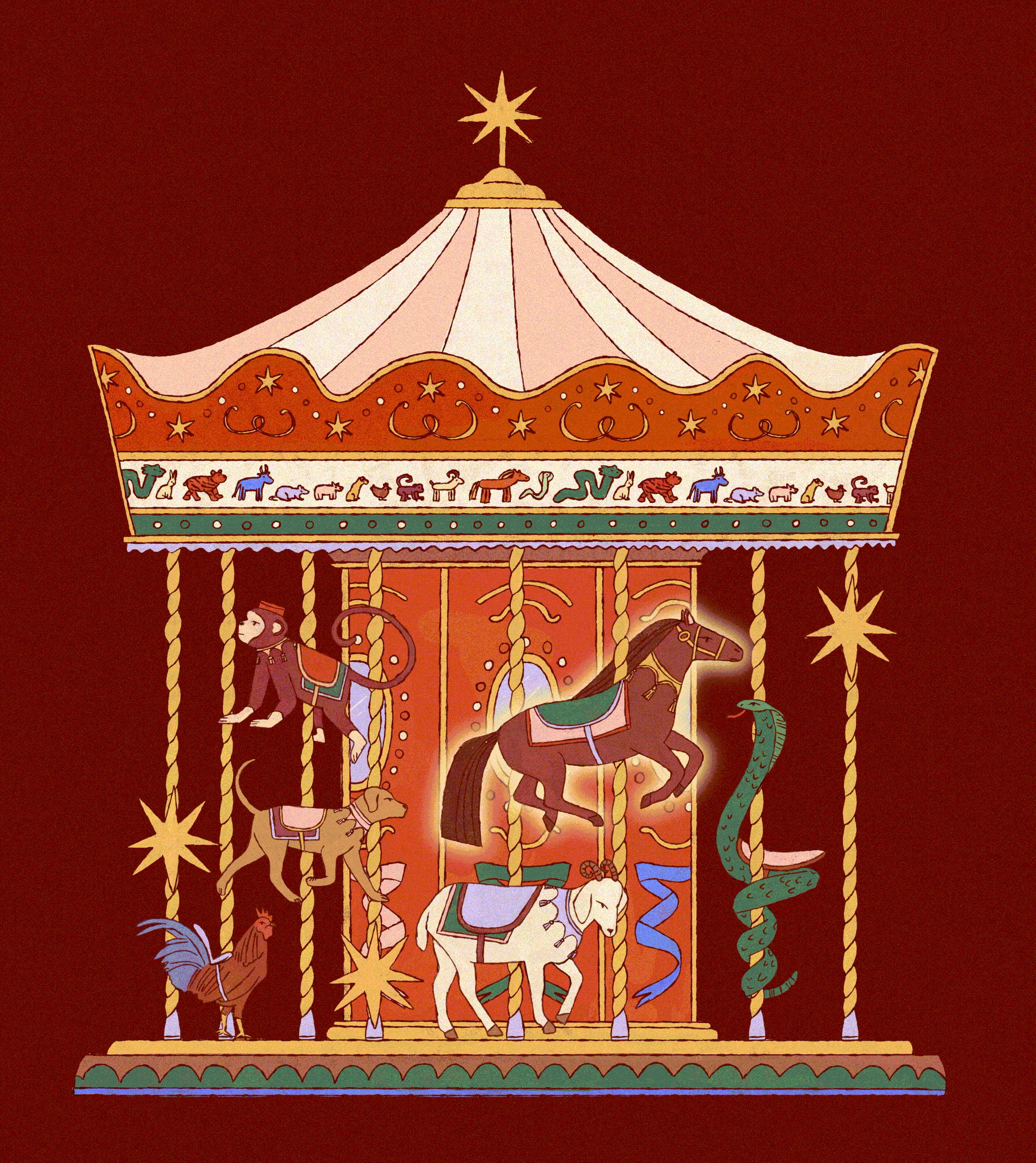 Every year I like to make some type of illustration for the Chinese New Year. This year I tried something new and animated my fire horse illustration. I thought about the cyclical nature of the zodiac and thought a carousel would be an interesting interpretation for the year of the fire horse.
