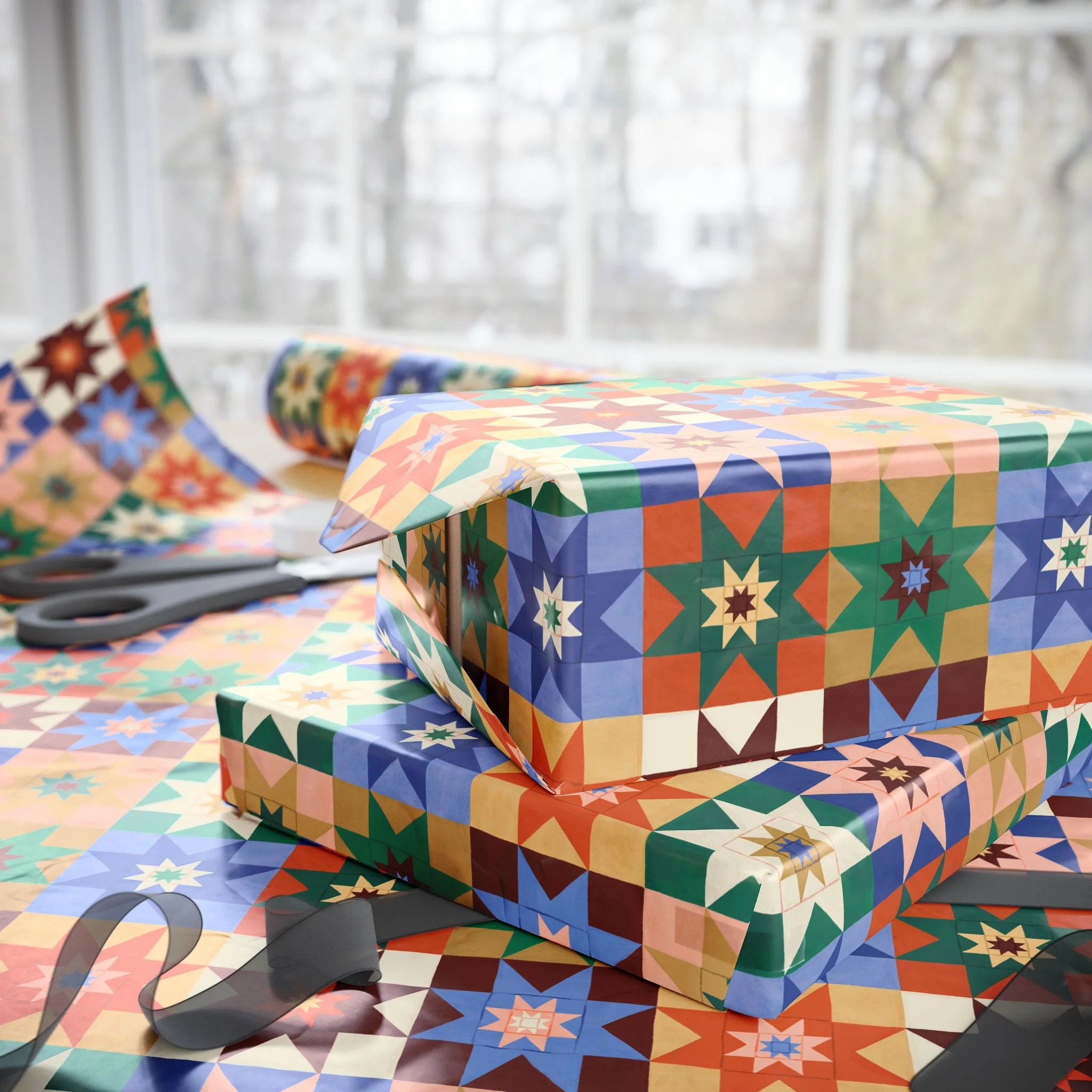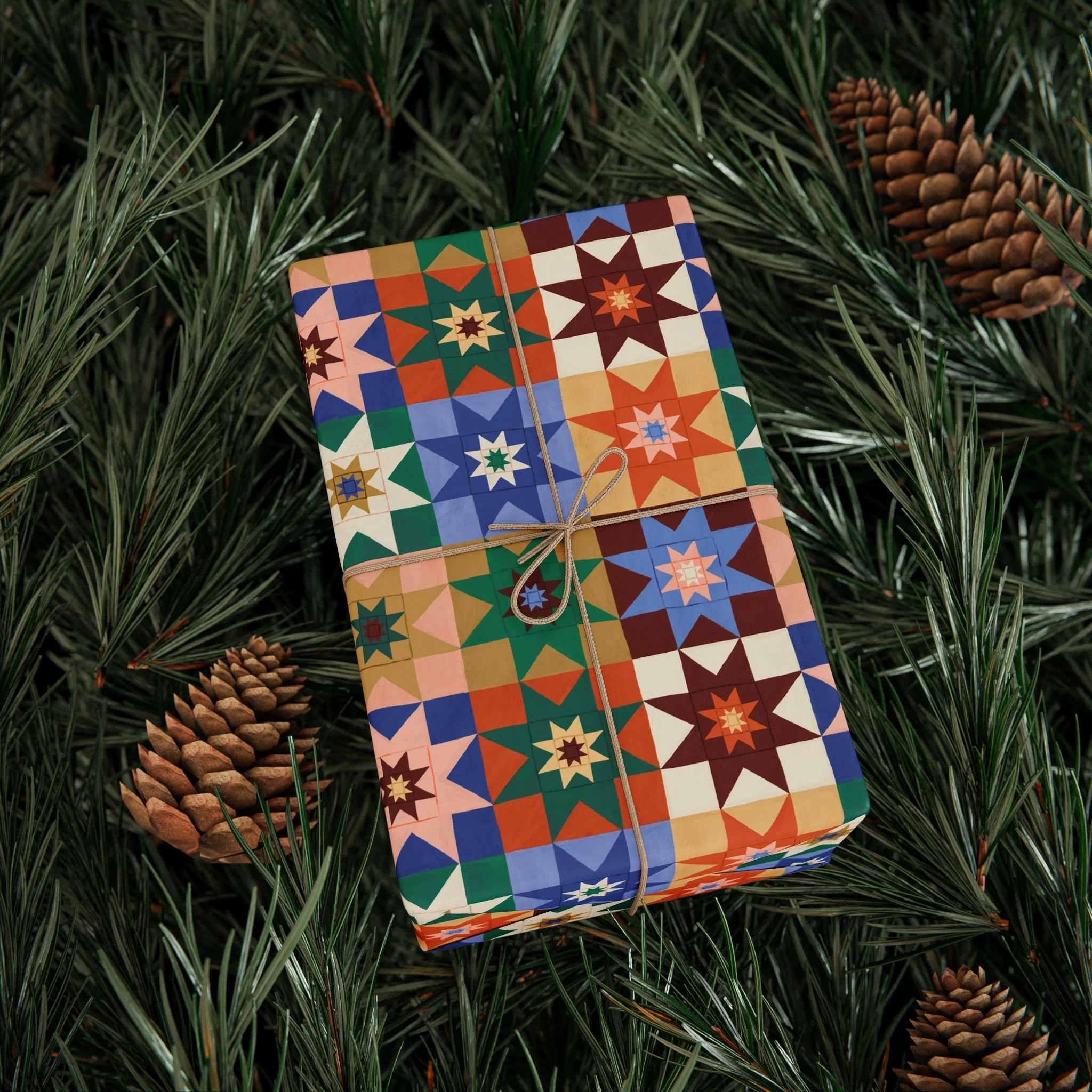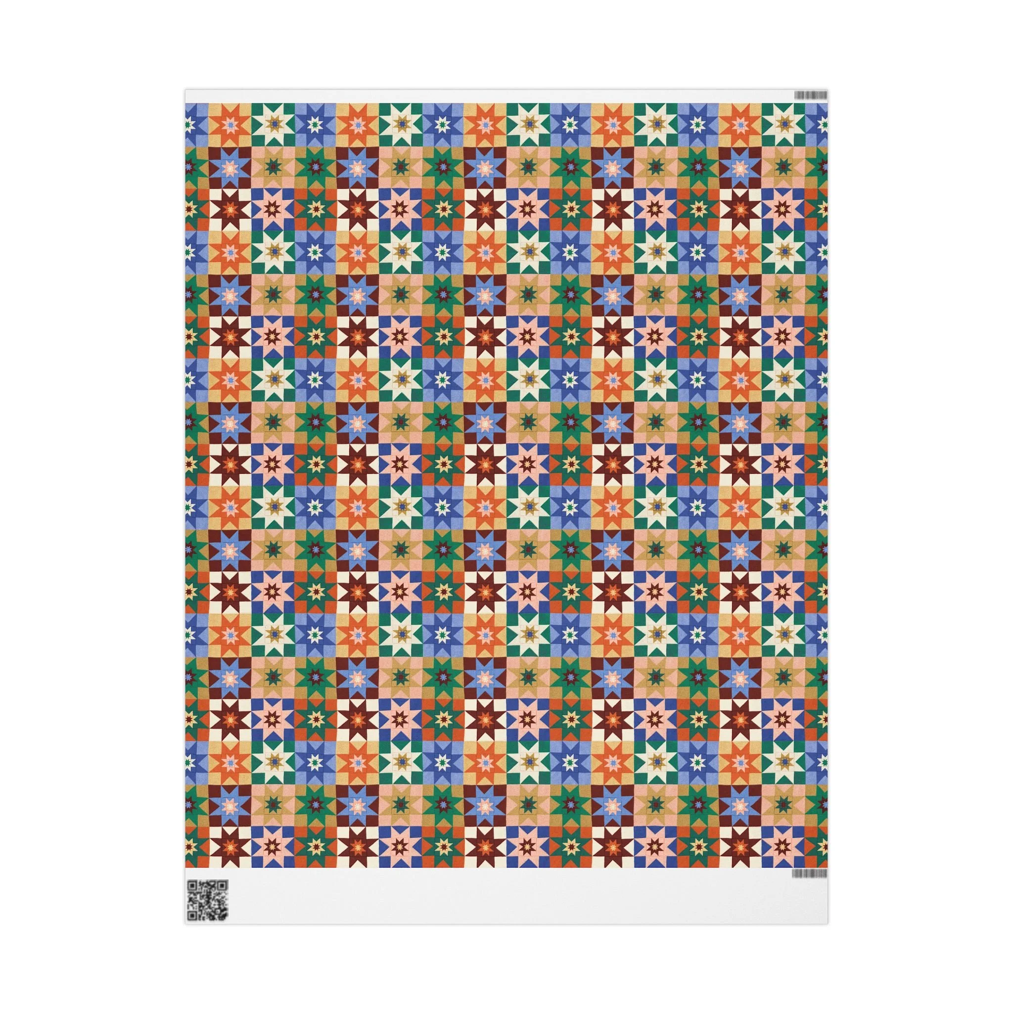A star quilt pattern gift wrap, inspired by old cozy quilts.
